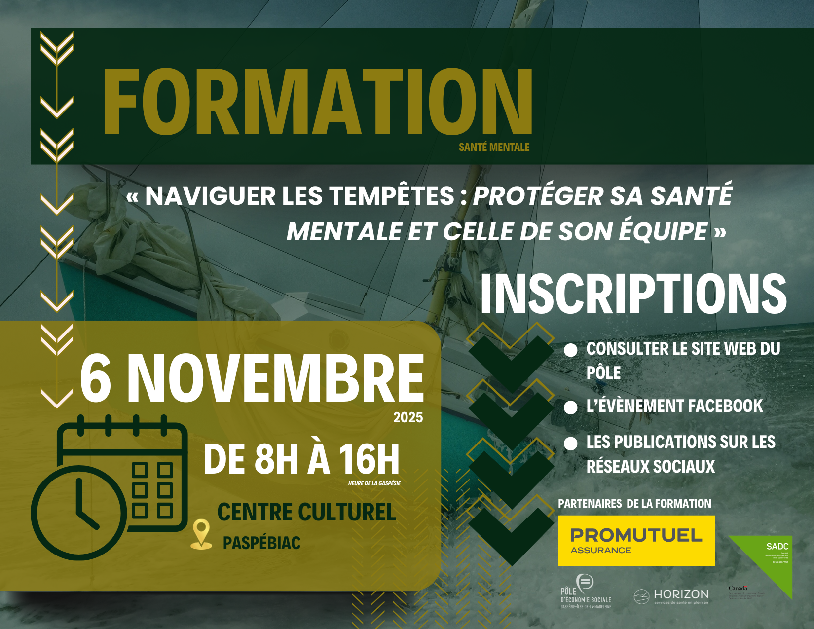 En primeur : votre inscription au colloque vous donne droit à 50 % de réduction sur la formation Naviguer les tempêtes : Protéger sa santé mentale et celle de son équipe , présentée le lendemain (6 novembre) au Centre culturel de Paspébiac, organisée par le Pôle d’économie sociale GÎM.