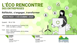 L’Éco-rencontre 2025 est une première édition d’un événement d’une journée entièrement dédié au développement durable en entreprise. Destiné aux dirigeants et gestionnaires, il vise à les sensibiliser aux enjeux ESG (environnementaux, sociaux et de gouvernance) et à les outiller pour amorcer une démarche structurée vers des pratiques d’affaires écoresponsables.